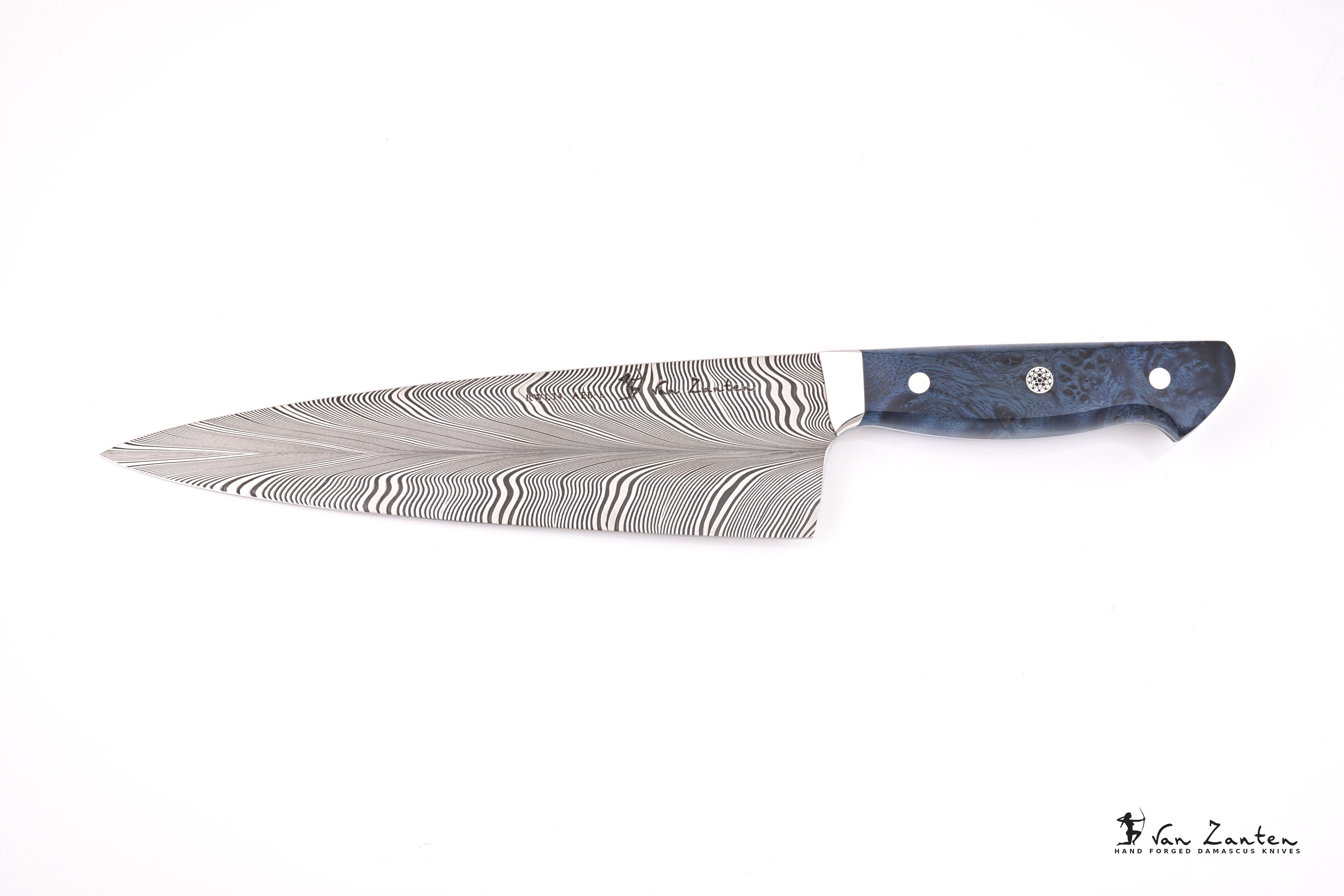 Dit koksmes is gesmeed uit 192 lagen damaststaal. Het willekeurige wilde damast patroon wordt telkens onderbroken door zeer fijne lijnen. Zodra je het koksmes beweegt in het licht vallen deze lijnen extra op. In het filmpje is dit te zien. De blauwe esdoorn waar het heft van gemaakt is heeft iets soortgelijks, er zitten zogenaamde spiegels in dit hout waardoor deze strepen ook verspringen zodra je het mes beweegt.