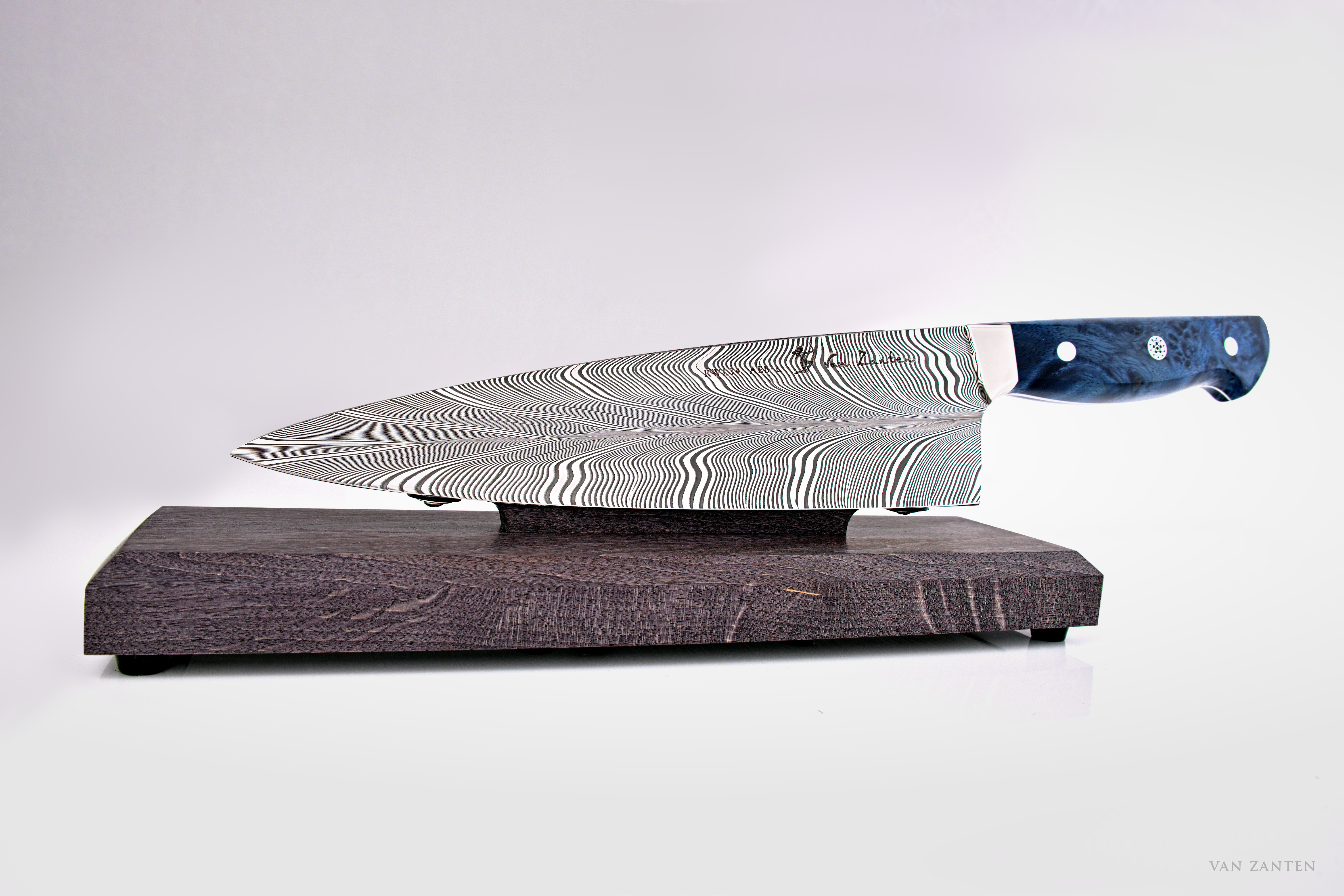 Dit hoogwaardige keukenmes is gesmeed door messensmid Johan van Zanten in Amersfoort. Voor het blad zijn twee soorten gereedschapsstalen aan elkaar gesmeed, uitgestrekt en dubbelgevouwen. Dit proces is 7 maal herhaald om 256 lagen te verkrijgen. Hierna is het smeedstuk getordeerd om een speciale tekening in de damast te krijgen.